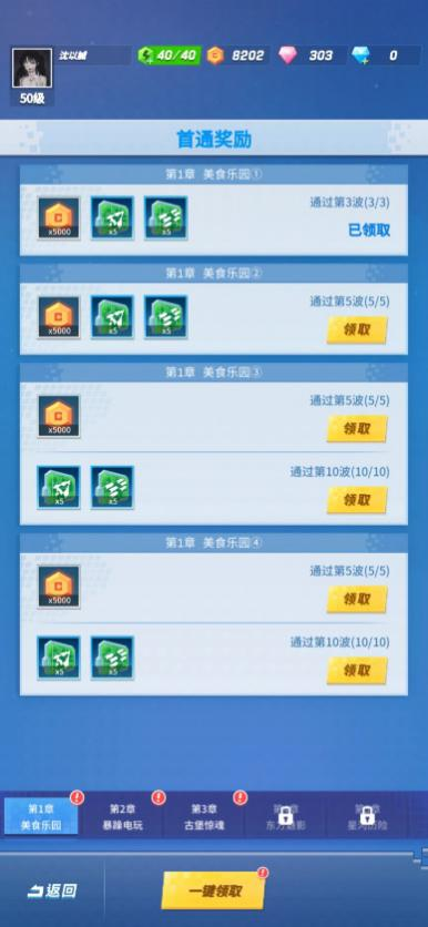 首通奖励即首次通过相应关卡领取的奖励,我们每通过一个新的关卡,都可以在这里领取一份首通奖励,初期关卡冲得猛也不用担心,一键领取功能将帮助你直接领取所有待领取奖励。