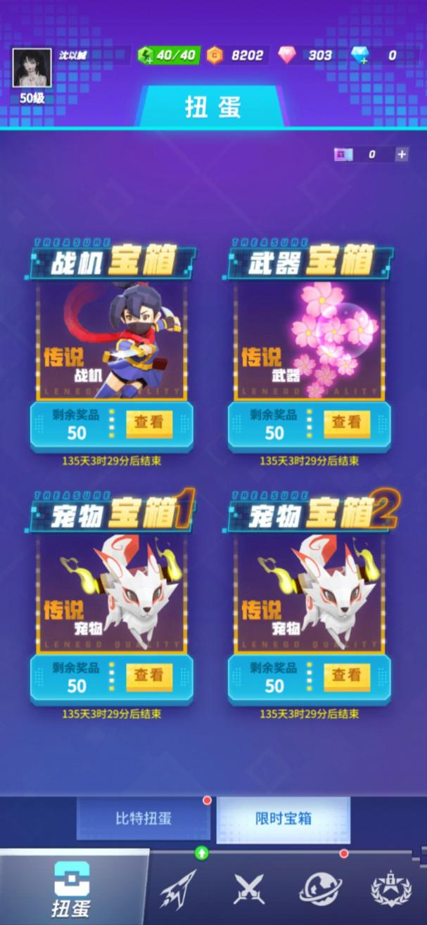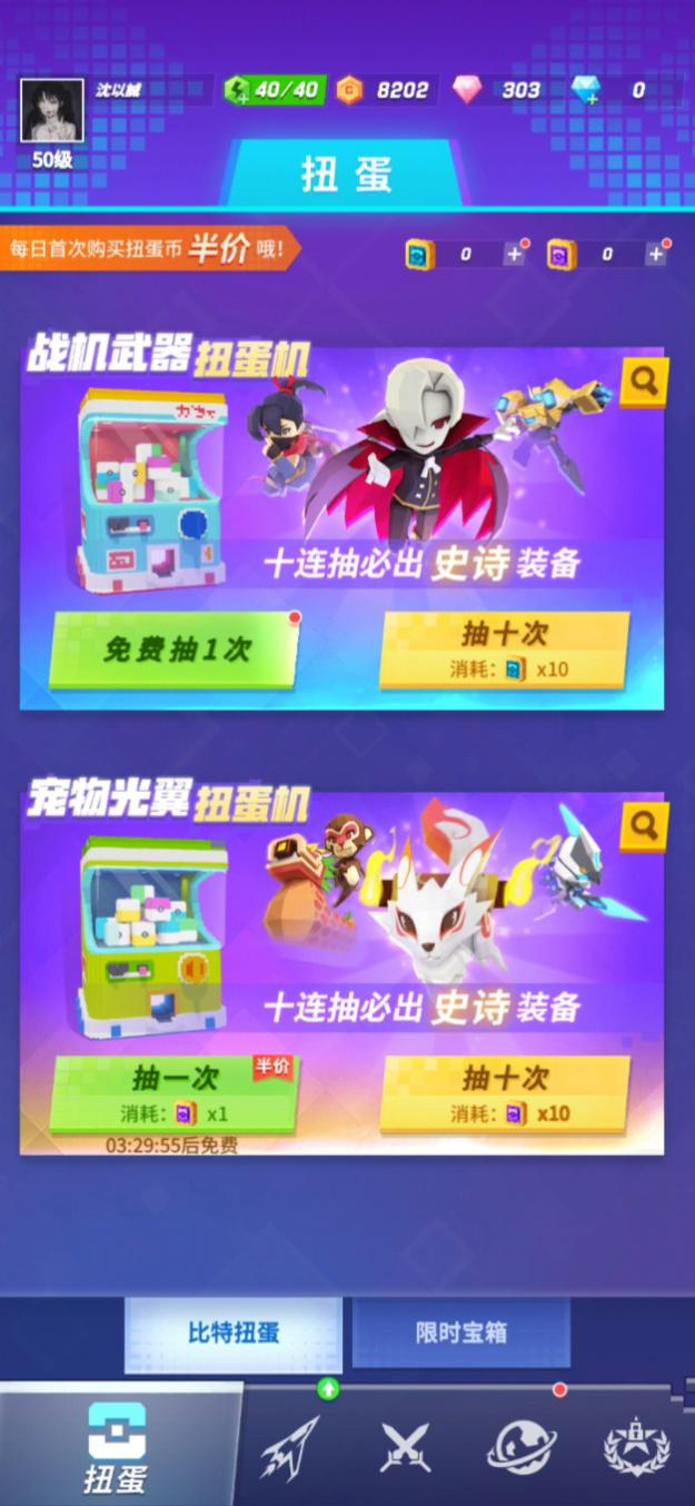 扭蛋界面分为比特扭蛋和限时宝箱,飞行员达到一定等级后,将开启全部扭蛋,通过扭蛋我们可以获得很多稀有的战机、武器以及其他道具。