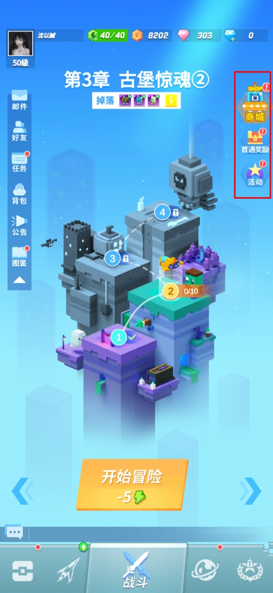 右侧按钮为商城、首通奖励、活动。