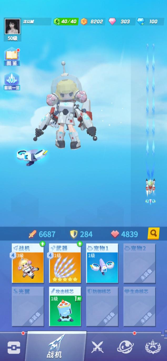 战机界面我们可以直观看到属攻击、防御、生命的综合属性。在这个界面,飞行员可以预览当前装备的战机、武器、宠物、光翼等特效;装备栏包括战机、武器、宠物、光翼、攻击核芯、防御核芯和生命核芯,点击进入相应的装备页面就可以进行道具的装备。