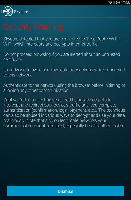 With Skycure, you can use your Android device to access sensitive and private information without having to fear that the network has been compromised. Skycure provides you with a seamless solution to secure your Android device and all apps on it, and detect network threats at all times.Organizations are rapidly embracing the usage of mobile devices in their business processes. While mobile devices promote business needs, they also open a window for security and privacy threats. One of the biggest risks today is network related attacks. This can lead to leakage of business-sensitive information, malicious access by hackers to internal corporate resources, theft of employee credentials (user impersonation), and damage to critical systems.After installing the Skycure app, you will:- Gain visibility and be alerted when a security incident occurs- Leverage the power of the crowd to beat hackers using Skycure's crowd-source engineIn addition, as an organization using Skycure you will:- Benefit from enhanced security capabilities against non-generic attacks- Automatically be protected against network threats- Take measures to prevent such incidents and secure your online activityWe’ve built Skycure’s app to ensure your privacy and day-to-day user experience aren’t compromised.Activation instructions:- Download Skycure's app from the Play Store and install it on your Android device- Open Skycure and activate the app using your email address- Complete activation by verifying your email address- Keep Skycure running in the background as long as your device is turned onPrivacy:In addition to standard permissions required to ensure your mobile device is secured at all times, Skycure also requests your location to identify the areas in which attacks are more likely to happen, the ability to prevent your device from sleeping to execute detections in the background, the device identifier for integration with third party IT solutions in your organization, and (depending on the organization configuration) the activation of device administrator to enable remote wipe.For more information http://www.skycure.com/privacy-policy/