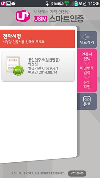 ★이제부터 공인인증서는 USIM에 저장하자!★LGU+ 고객만이 가질 수 있는 특별한 혜택!이제 공인인증서를 불안한 USB나 PC에 저장하지 말고 휴대폰 USIM에 저장하여 보안과 휴대성을 모두 챙기자!!★USIM 공인인증을 무료로 즐기자!!★USIM 공인인증은 2013년 11월 까지 무료로 이용 가능 합니다.(무료 이용 기간 종료 시 서비스가 유료로 전환 될 수 있습니다.유료 전환 시 자동으로 유료 전환되지 않으니 안심하시고 사용하세요~)※USIM 공인인증 이란?지금까지는 보안이 취약한 PC나 USB 및 SD메모리 카드를 이용하여 공인인증서를 저장하였지만,본 서비스는 해킹이 불가능한 USIM칩에 공인인증서를 저장하여 보안을 극대화한 보안 서비스 입니다.- 뱅킹, 증권, 본인인증 과정 중 전자서명이 필요할 때 사용 가능 합니다. - 해당 서비스는 LGU+ 고객님만 이용이 가능 합니다.- 고객님의 통신요금 방식에 따라 (3G/4G) 데이터사용료가 발생할 수 있습니다.※USIM 공인인증 주요기능1. 인증서 관리(공인인증서 관리)- 발급 받은 인증서를 삭제 할 수 있습니다.- 인증서의 유효기간을 확인 및 업데이트 할 수 있습니다.2. 인증서 복사(PC복사, QR코드 복사, 스마트폰 복사)- PC나 USB 저장메체에 있는 인증서를 USIM칩에 복사 합니다.- SmartPhone SD메모리 카드에 있는 인증서를 USIM칩에 복사 합니다.3. 전자서명 (뱅킹, 증권, 본인인증)- PC에서 전자서명이 필요할 경우(은행/관공서/증권사 등) 불편하게 인증서를 찾을 필요 없이 휴대폰 번호만 누르면 휴대폰 USIM칩에 있는 인증서를 볼 수 있습니다.- 인증서의 비밀번호가 아닌 보안토큰(USIM 공인인증)의 서비스 비밀번호를 사용하기에 안전성이 더욱 뛰어 납니다.- 최종 인증 시 스마트폰으로 다시 한 번 확인하여 본인이 아니면 최종 인증을 할 수 없습니다.※USIM 공인인증 이용안내1. LGU+고객님만 이용이 가능 합니다.2. 서비스 이용 문의 : 휴대폰 114 또는 1544-0010 , 이메일 : usimcertvoc@gmail.com3. 서비스 장애 및 기술 문의 : 070-8240-3062, 이메일 : usimcertvoc@gmail.com4. USIM 공인인증 서비스를 위하여 PC에 설치되어 있는 전자서명툴을 업그레이드 합니다.(다운로드 하기 : http://download.raonsecure.com/usimcert/usimcert.exe)5. 자세한 서비스 이용 및 문의는 http://www.usimcert.com 로 접속 하시면 안내 받으실 수 있습니다.※USIM 공인인증 유의사항- 휴대폰 A/S시에는 고객 정보보호를 위해 USIM 공인인증에 저장된 공인인증서를 삭제하신 후 A/S를 받아주세요- USIM 공인인증을 더 이상 사용하지 않는 경우, 고객 정보보호를 위해 본 애플리케이션 삭제 전에 모든 공인인증서를 삭제한 후 애플리케이션 삭제를 수행하세요. - USIM 공인인증에 폐기된 인증서가 남아 있을 경우, 해당 인증서를 삭제하여 주세요. - 휴대폰 분실 시 공인인증서를 발급 받은 인증기관을 통해 반드시 인증서 폐기를 하신 후 인증서를 재발급 받으세요. - 휴대폰 사용환경을 임의로 변경할 경우(루팅, 해킹 및 기타), USIM 공인인증은 동작하지 않을 수 있습니다.