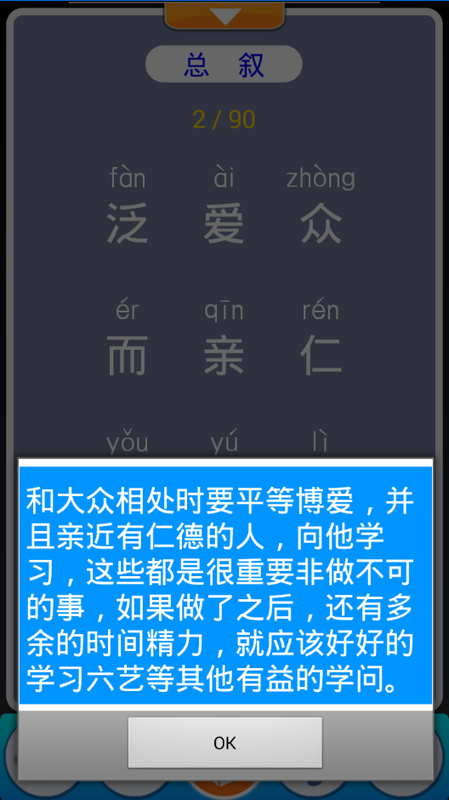 用全新的方法学习弟子规,总共 90 张卡片,每张卡片皆有真人语音朗读与说明。是学习弟子规的最佳辅助教材!★ 超大字体,保护眼睛。★ 支持真人语音朗读。★ 支持拼音辅助阅读,方便小朋友背诵!★ 每张卡片皆有提供注释。