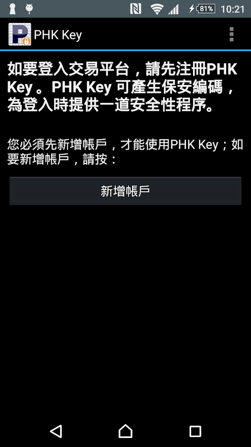 PHK Key 是一款用戶在登入平台的加密类型軟件。是由輝立証劵(香港)有限公司開發的電子保安編碼器,加強保障客戶的網絡安全軟件。它為客戶在登入輝立客戶平台時提供雙重認證保安編碼。\\r