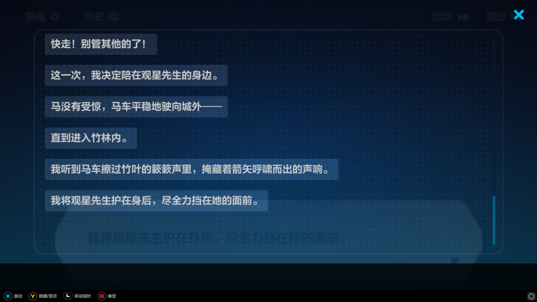 舰长再次轮回,劝观星离开煌月城无果后,决定同观星一同捉拿“灰蛇”,在观星认为胜券在握之时,背后的刀,再次向她刺去。但与之不同的是,这次,我们在她身边。毫不犹豫地,我们挡在观星背后,为她挡下了这致命的一刀。