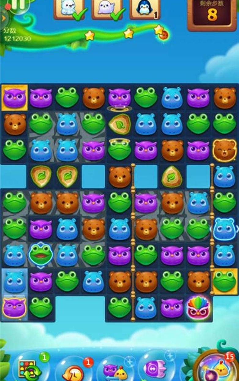消除右侧银币,让闪电鸟落到彩虹盘以后触发闪电特效。消除激活右上方魔法石以后带动消除毛球。激活一对星星瓶子让它们在一起以后交换。消除中上方的魔法石,打开左上方空间以后消除左上方魔法石带动消除左下方雪块。此关卡难点是最左下方的雪块,后期有消除就优先。开局主打银币,让闪电鸟下落自动清屏。然后追着魔法石打毛球,让星星瓶充满能量后交换。最后主打上面魔法石就轻松三星过关!