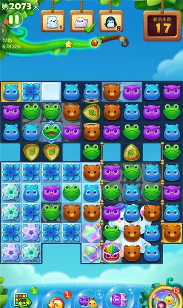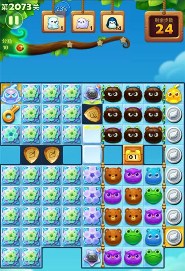 加三,消银币,让闪电鸟落下来对碰,拿到钥匙,再激活魔法石,尽快消除冰块,再组特效和鸟来收集动物,主要打魔法石!星星瓶先别管!待把左上角的魔法石点亮后扩展下空间!俩星星瓶已分开!各自带上特效轰炸效果更好!以上是 2073 关卡攻略希望能帮助到小伙伴。祝小伙伴快速通关!!!