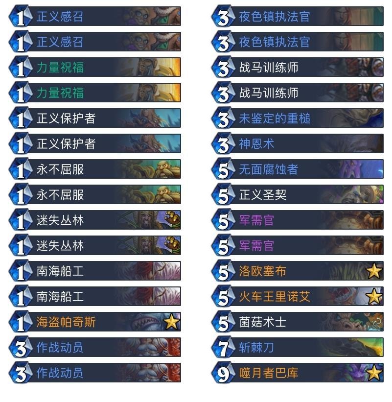 由于卡组中有很多卡能给武器,而且耐久度普遍比较高基本不存在脸上没武器的情况,本身具备海盗属性,可以拿出帕奇斯,所以满编了
