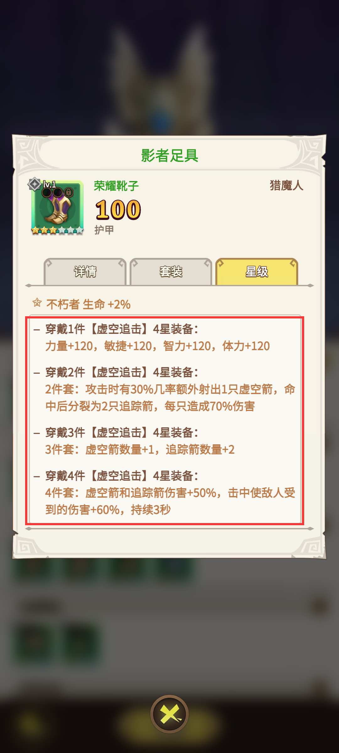 猎魔人的装备推荐选择虚空追击系列荣耀套装,四件套可额外射出虚空箭,命中后可分裂出数支追踪箭,箭矢伤害极高,且能增加敌人受到的伤害,相当于一个易伤 debuff,不仅适合应对 PVE 场景,对于 PVP 竞技挑战也非常适合。
