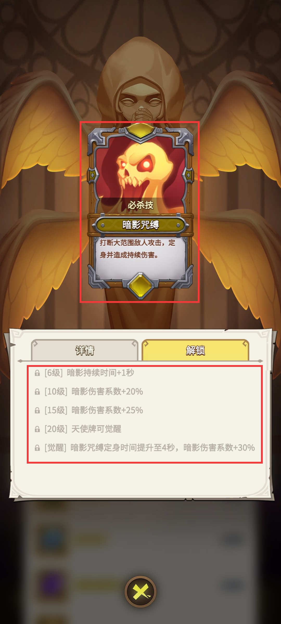 猎魔人的天使牌搭配可选择的余地较多,由于目前放出的必杀技和守护技只有两个,因此这两个天使牌没有悬念,必杀技选择暗影咒缚,可打断大范围敌人攻击,定身敌人并造成持续伤害;守护技选择暗影迷踪,可以大幅降低受到的伤害,并提升移动速度。一控制,一防守,配合攻击力强悍的猎魔人,如虎添翼。(想要完全上手需要多次练习才行)