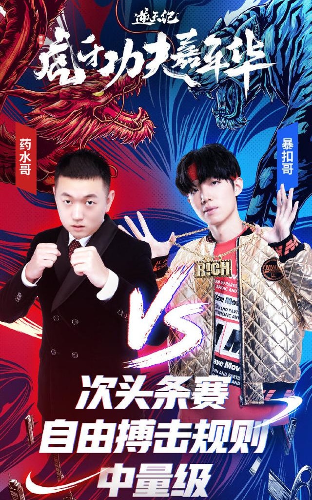 在开幕式的称体重环节,虽然一上来暴扣利用自己说唱技术以及身高优势碾压了药水哥,但是药水哥早就是有备而来,请出龙王之后扭转了场上战局,这段称重环节的 Battle 最终还是药水哥更胜一筹。