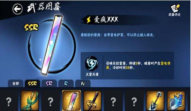 这款武器呢是 SSR 级别的神器,属于一种保命的神器,技能的是义雷天盾,可以召唤无敌雷盾,持续五秒钟。盾破时产生雷电情景,冷却时间 35 秒。这可以说一款保命神技了,可以无敌五秒钟。BOSS 碰到我们的盾的话,我们也是可以继续打输出的。这边建议搭配上朱雀直接贴脸波斯打出爆发的性子伤害。这款武器比较适合操作不太好的玩家,毕竟还是保命类的嘛,输出能力的话,还是比较差的。但是保命是真的好用,你想一下每过 35 秒就可以,无敌五秒钟的时间是不是很好用呢。