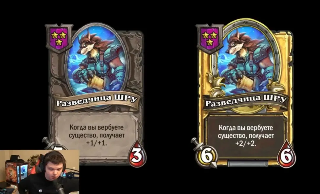 二星 3/3 种族:全部,每当你的融合怪获得属性值,该随从也会获得。金卡获得双倍