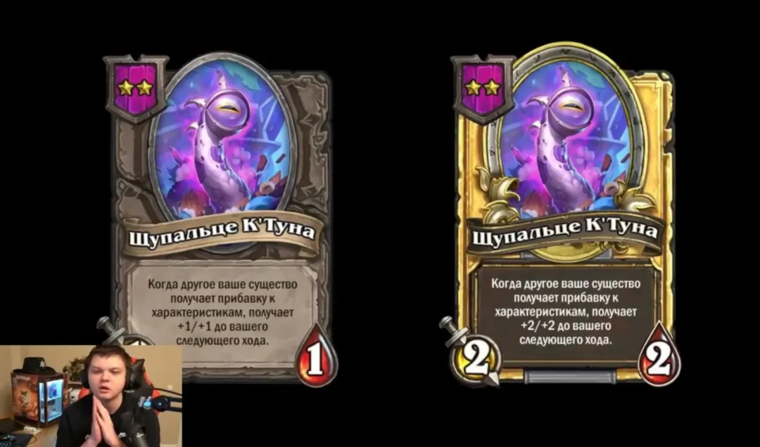 而星 1/1,直到你的下一个回合,在另一个友方随从获得属性值后,获得+1/+1。金卡获得+2/+2。