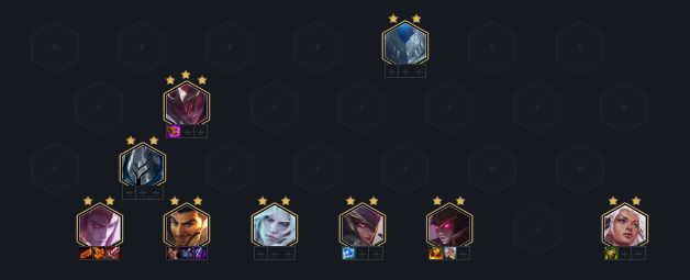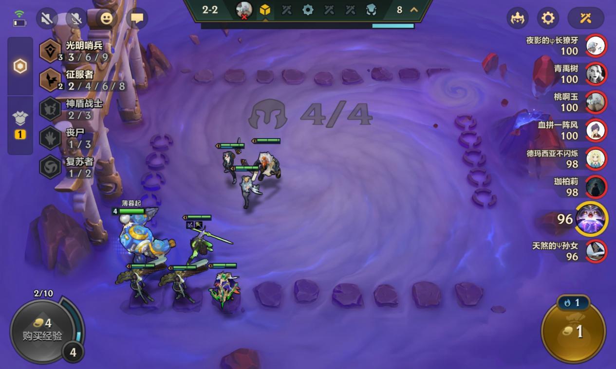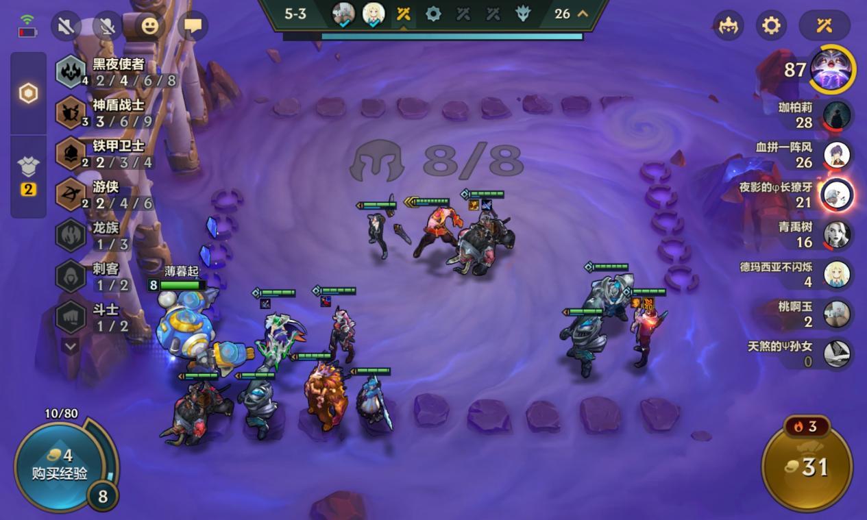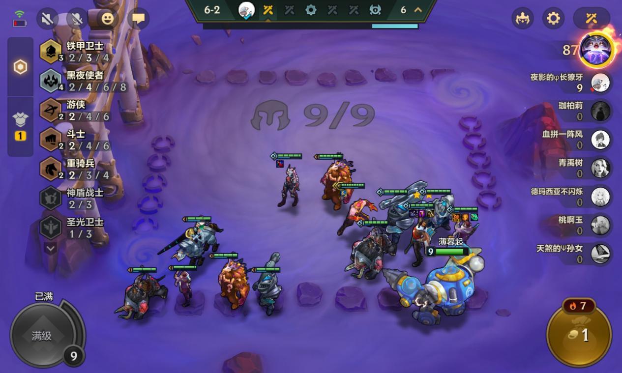 大换阵容之后我们拿到了 2 星的厄斐琉斯黛安娜和贾克斯,三张 4 费卡的 2 星足以满足这个阶段的打架需求,此时我们选择继续存钱上 9 补上佛耶戈来凑出 2 刺客 3 神盾的羁绊。