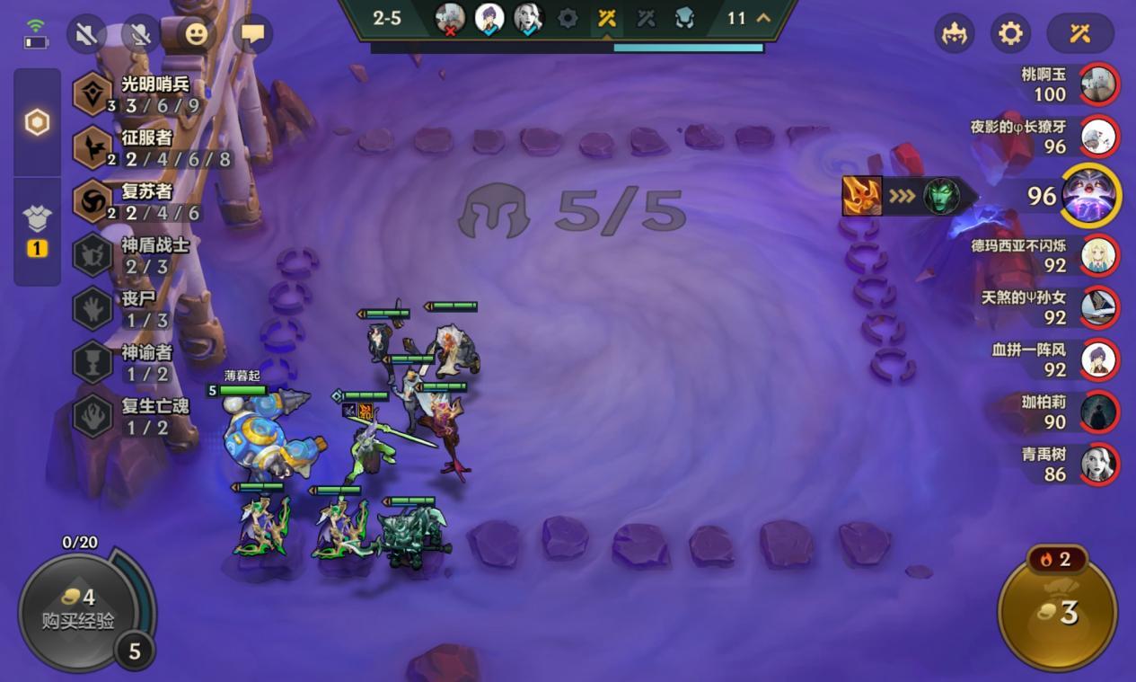 5 级艾翁来了我们可以搭配上洛来凑出 2 复苏羁绊,这里不选择去找第 3 张神盾,因为艾翁的技能机制可以让场上多增添一个人口。