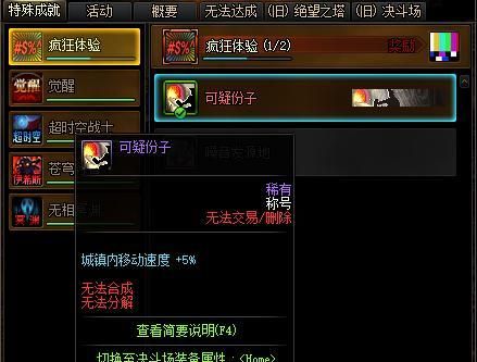 可疑分子这个称号获对于经常挂机的玩家还是挺容易获得的,只需要在城镇站街 5 个小时就能获取,在中途不可以切换服务器和频道,否则会重新倒计时,最害怕的是在站街的过程中突然来个六字真言,这样又要重新来过了。