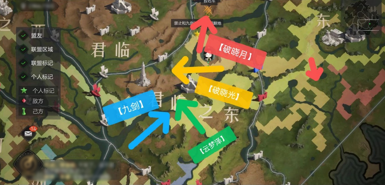 在巨大的实力差距面前,【云梦泽】被打得节节败退,只好迂回作战,在君临东与之周旋。【破晓】见【云梦泽】撤退得毫无章法,误判形势,以为其慌不择路,遂派遣一部分成员帮助分盟发育。但就在这时,本区的第一大盟【九剑】从君临西破关进入了君临东。