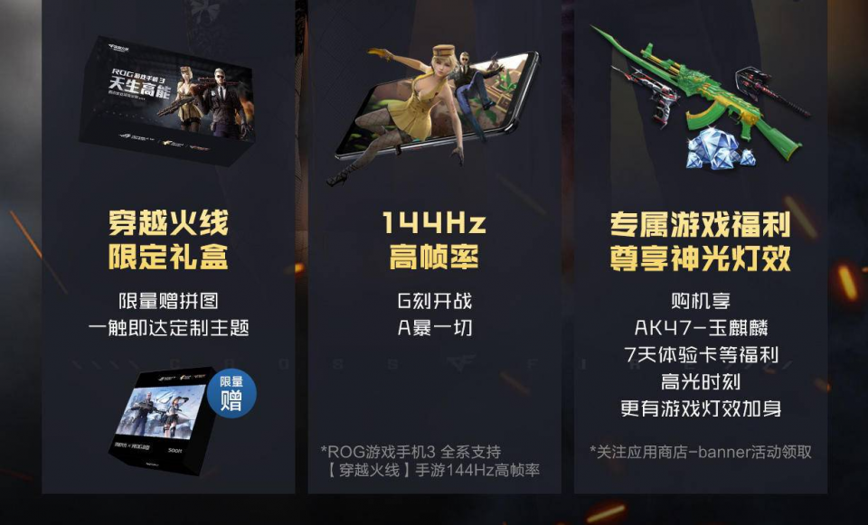 要问为什么,主要是 ROG 游戏手机 3 穿越火线特别版的强大性能流畅运行 CF 手游版有保障。高通骁龙 865 Plus 芯片比起原版大幅强化了图形性能,这对 CF 手游这种画面复杂、追求高流畅度的游戏来说有很大帮助,配合 ROG 游戏手机 3 的 144Hz 超高刷新屏幕,玩 CF 手游的时候帧数可以稳定在 120 帧以上,大大提高游戏中的爆头率。