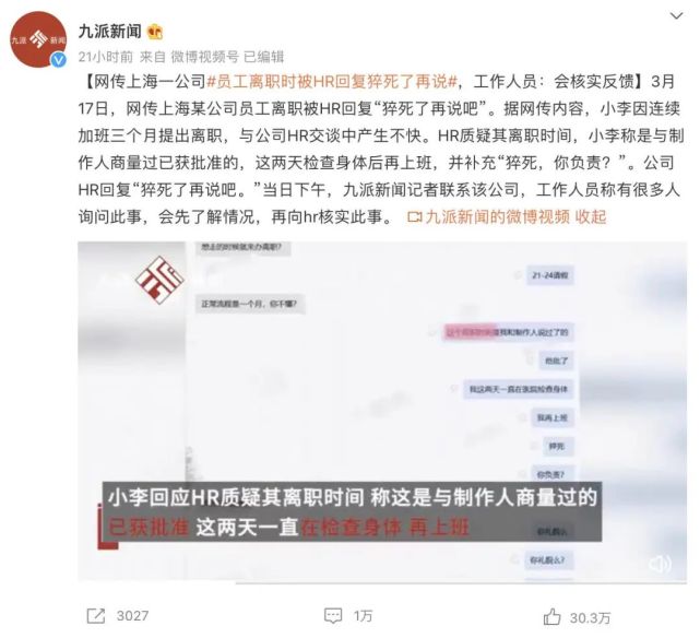 3 月 16 日,脉脉上一名认证为「上海哆爱咪网络科技有限公司员工」的用户发布了一则帖子,称向 HR 提出了离职,中间有几天希望请假,说自己身体不舒服害怕猝死。结果 HR 回复:\"先猝死了再说吧\"。