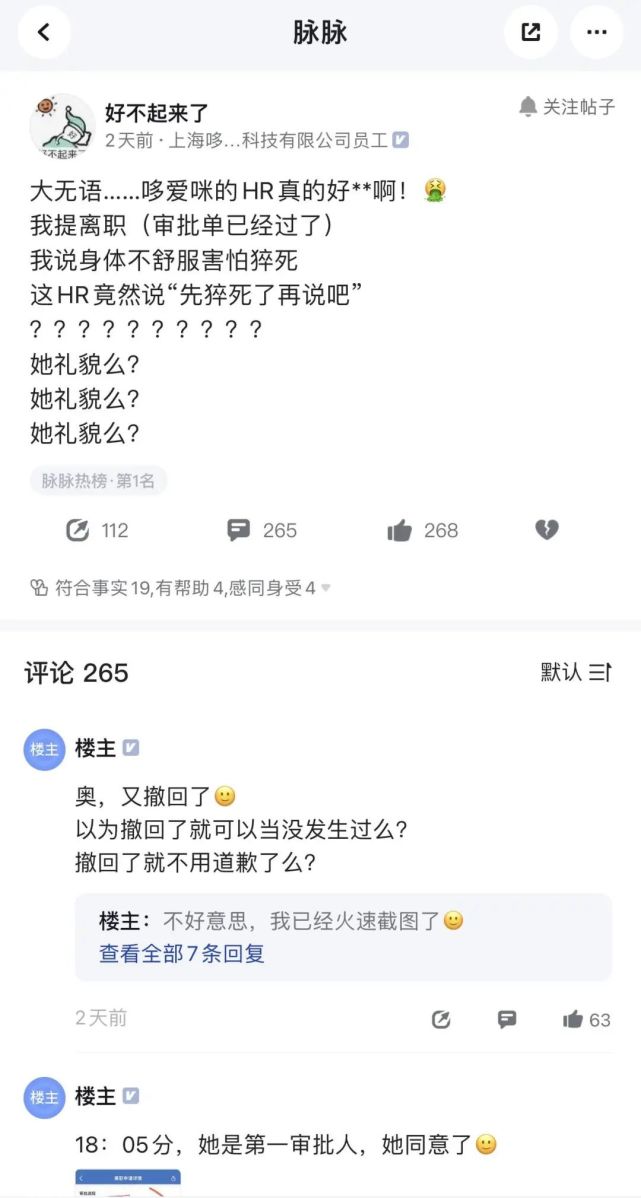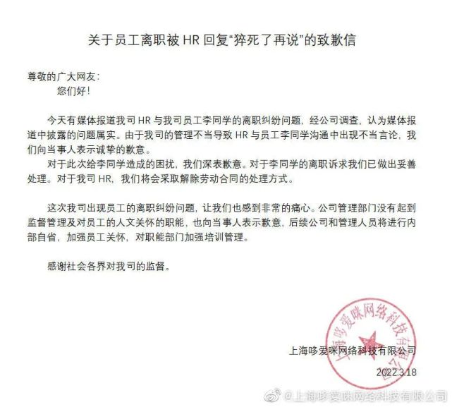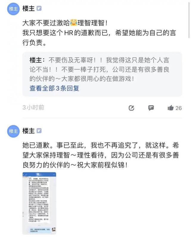 在脉脉上,那位发帖的离职员工也呼吁大家不要态度过激,自己只是想要 HR 的道歉,并在 18 日下午贴出了 HR 的道歉截图,表示自己不再追究。