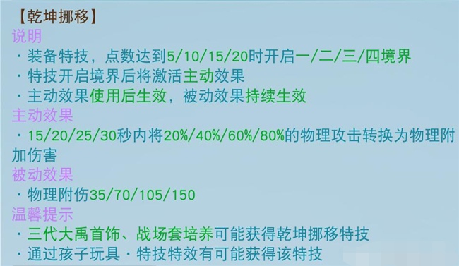 另外,还要推荐特技【乾坤挪移】。当前版本的天机想要打动人,要么拥有装备压制,要么有破甲能力。如果双方装备水平相似,这时则需要用乾坤挪移将部分攻击力转化成物理附伤。