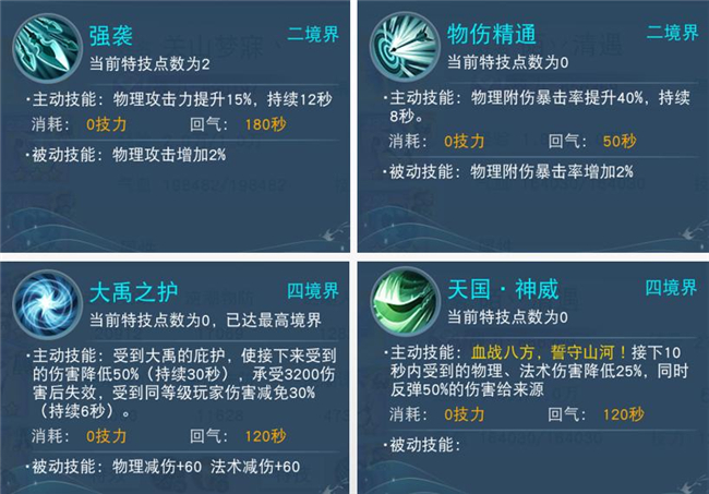 下面四个特技是暴力流天机的主流带法。强袭和物伤精通提升天机的攻击力和物理附伤解决打不出伤害的问题。大禹之护和天国·神威偏防御,配合天机本身防御力强的特点,能提升输出时的容错率。
