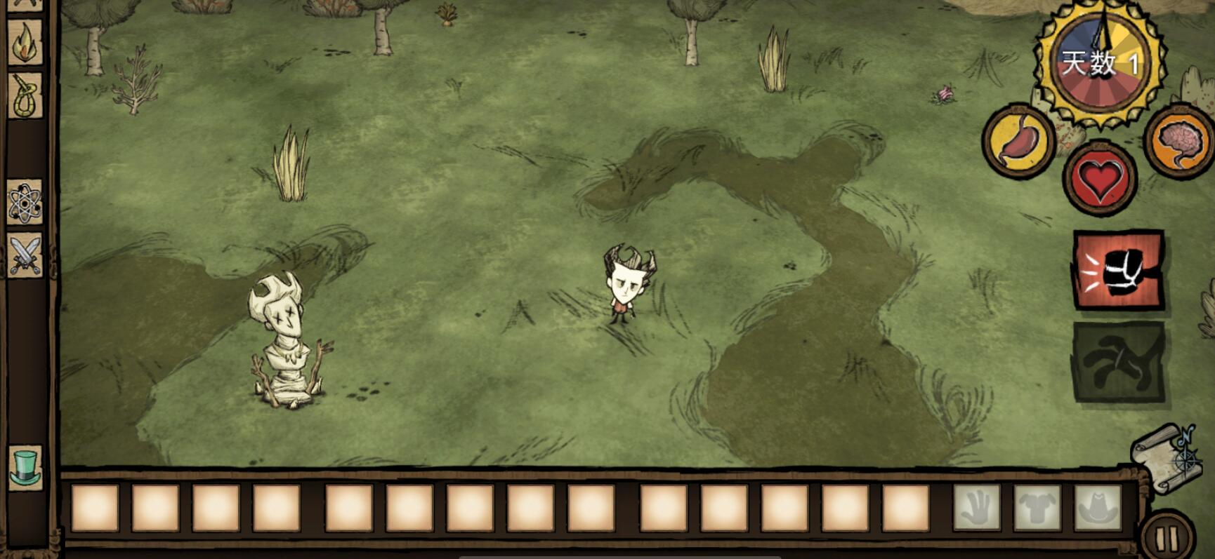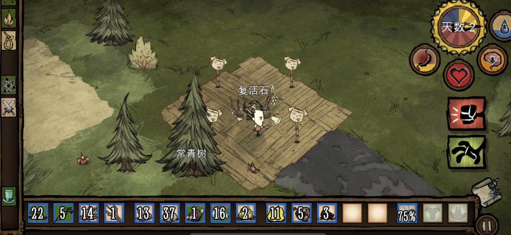 首先在开局之前大家可以选择一些捷径来帮助自己,比如过找一些自己比较感兴趣的 mod,例如:死亡可存档、背包扩大器或者快速收集材料等“作弊”方式来降低游戏难度。如果中规中矩开始游戏的话,那么比较适合在第 1 到 2 天游览清楚地图布局,并在旅游的过程中收集较多的食物还有燧石、小树枝、草(这几种材料每个格子存储的上限都是 40),因为要它们制造鹤嘴钳以、斧子来开采石矿和砍伐树木还有用来黑夜照明的火把。