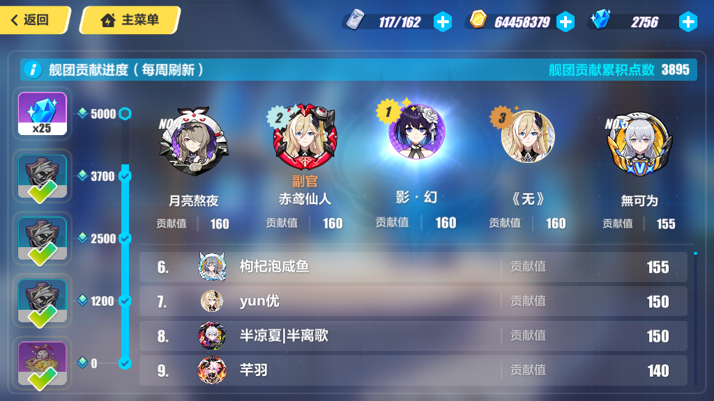 加入任意舰团,主界面——舰团——舰团贡献,做满 5000 即可领取 25 水,这个主要是根据舰团活跃来的,所以加入一个好的舰团也很重要,每周刷新一次