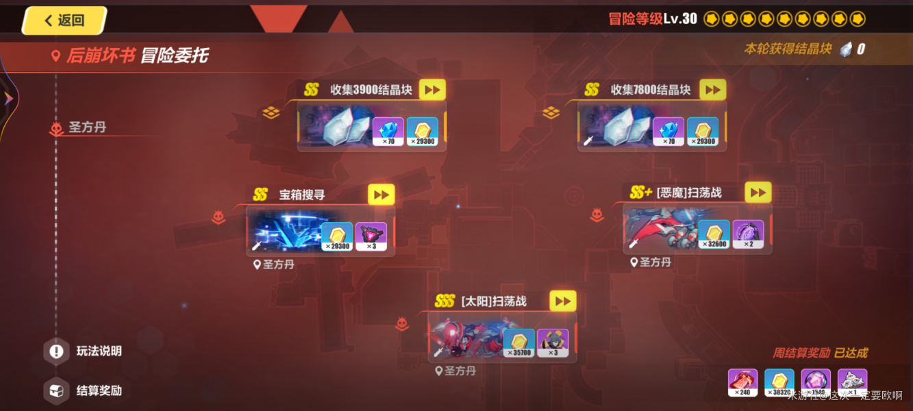 如果你运气够好会刷到一些水晶委托,建议接取,领到的水晶使用方法和家园水晶打工一样,这里就不赘述了另外后崩坏书 2 完成对应的任务或目标可以获得丰富的水晶