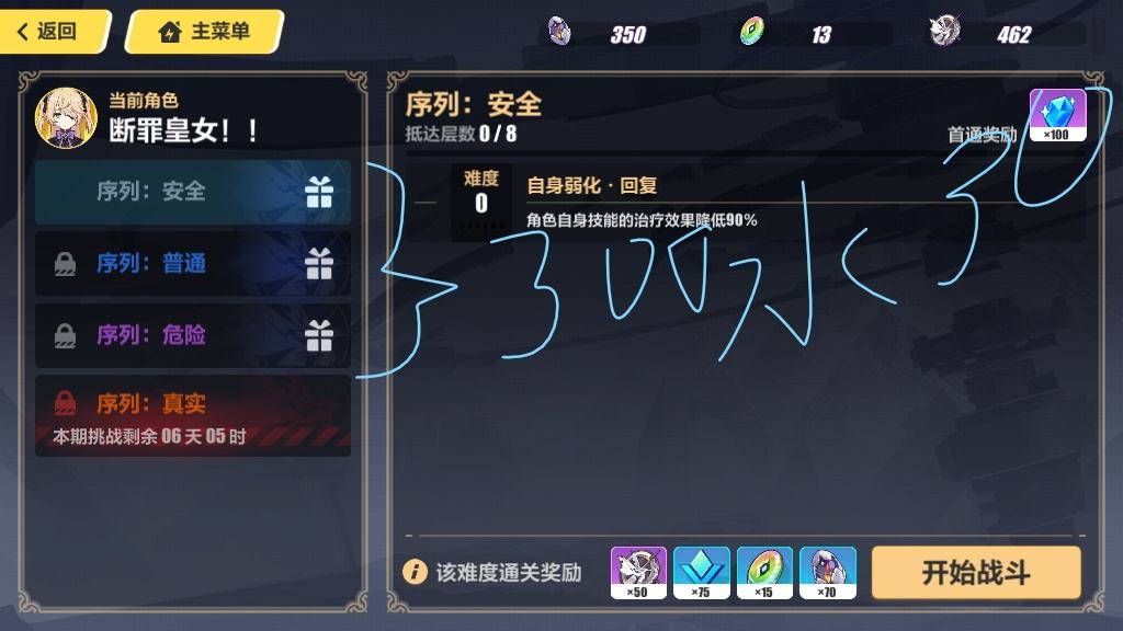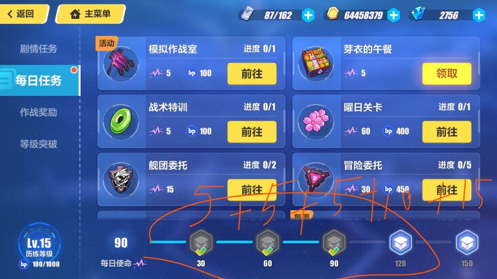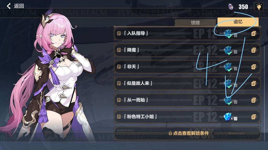 做满对应任务即可拿满 15 水/关(主线后期是 30 水/关),这里我给个小提示,连击数用高频角色(如德莉莎系、炎律等)伤害溢出就扒掉武器圣痕,闪避技术不行的可以试试能主动闪避的角色慢慢打,比如炎律黑希神恩等,如果真不巧这两个任务都在同一个关卡出现了,那就先别攻击,把闪避任务做完再做连击数。至于那种伤害类的,实在伤害不够先放下,等后期号练起来了再回头打,如果想升级快点就开学习芯片这里之前也讲过。