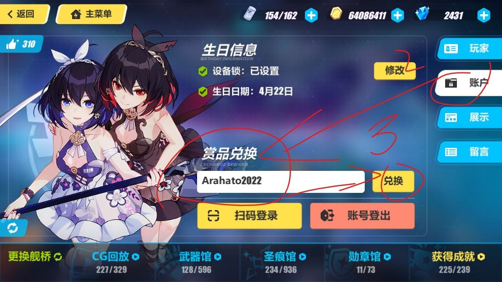 这里我讲下兑换码使用方法,首先你要获得一个兑换码,比如版本更新直播,然后进入主界面,点击左上角昵称——账户——赏品兑换 里面填入兑换码点击领取,兑换即可,另外这次活动剧情也有个小彩蛋,不知道大家发现没有。