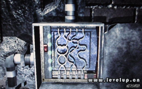 从铁门进入小巷,调查墙边的控电盘。无根线由右到左排列分别对应左侧的 5 个指示灯。调整接线后按方块键检测电力,从左到右检测,以此对后亮起小灯。如图所示,排列好线后按方块键测试电力。