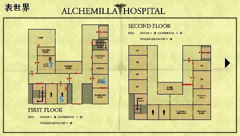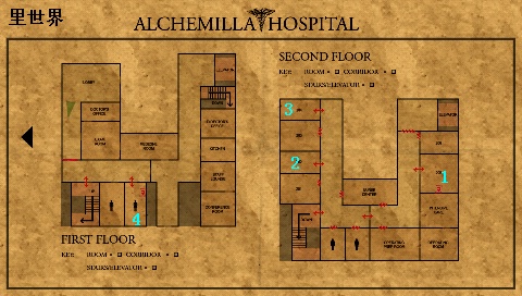 来到医院,进门后右侧的墙上拿到医院地图,左侧的墙上有记录点.这里没有怪来到电梯口触发剧情,上电梯来到 2 层来到一个储藏室触发剧情传说中的女护士登场~拿起左手边的锤子干掉他,进入 205 房间在架子上拿到一张纸,准备出房间时候发生剧情,来到里世界.