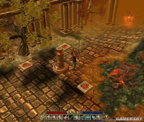 回到老法师那里,法师说,当年武林秘籍葵花宝典已经被分成 5 份,散落在这张地图上,你去找回来到我把它送给你。。有 5 个地点,从地图上可以大致分辨出位置(有!号的方向)每本书拿了都会有一个精英骷髅出来领便当,所以拿之前最好小怪清了。辛辛苦苦杀完回去找到老法师,猪脚表示葵花宝典就不必了,经验和钱即可。老法师付完账后又说,这城里有 3 个金色雕像,但是有群怪物天天在那里拉屎撒尿,我完全受不了了,你把他们拖去腌了。3 个大嘴精英怪,看着就恶心,杀掉就行。其中一个就在接任务的右下方,另两个在进传送门左右各一个。边吐边完成任务之后,老法师表示任务还有很多,并且很不客气的继续说下一个,就是有一群怪在天上飞,但是你打不到他们,我拿出包里的新手弓心说大不了打慢点,老法师这时候又说了,当年那谁射日的时候,用完就扔,扔在进传送门右边最下面的那个地方,有个便当火魔在守着。我一路飞奔,很快火魔就便当成功了,传说中的射日弓掉落在地,可是不是说有怪在天上飞么我怎么一个没看见?说时迟那时快,我一把拣起射日弓,飞天怪便纷纷现身出来受死。。。不会反抗,飞来飞去,一顿狂 AAAAAAA,就行了(说到这里,我突然发现我的 A 键上的字迹已经不见了,可见此游戏 A 的重要性,不过回想起来,此 A 应该是被 DOTA 之类的 WAR3 游戏摧残掉的)杀完之后回去,老法师表示此弓不能给你,还是给你钱吧。。然后就说时机差不多了,去把里面的火巨人杀了吧,以你的实力,撒泡尿就把它熄了。来到门外,有个机关,4 个柱子,先点左下的,把剑头指向中间,同样再去点右上的就可以把 4 个都指向中间,就可以进去了。