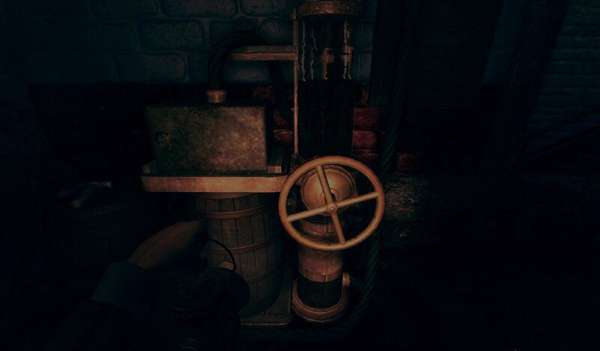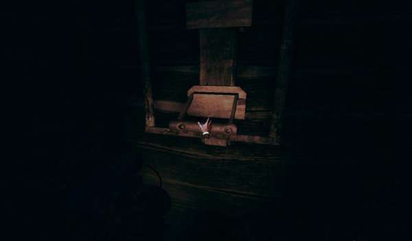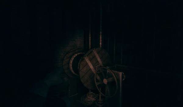 第一个保险丝烧掉了,去隔壁屋子取一个装上就好,先别急着走,去周围转转能看到一个木制滑轮,逆时针摇动可以把对面的梯子降下来。