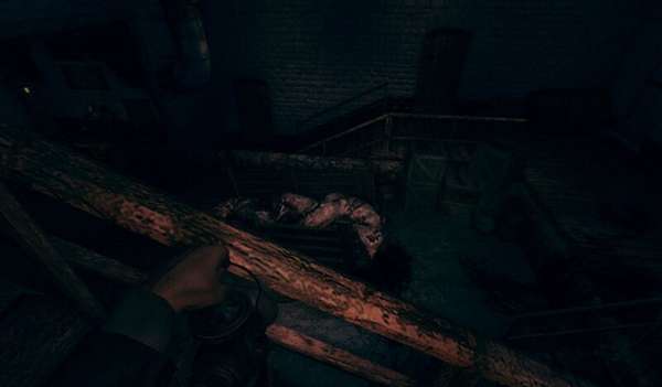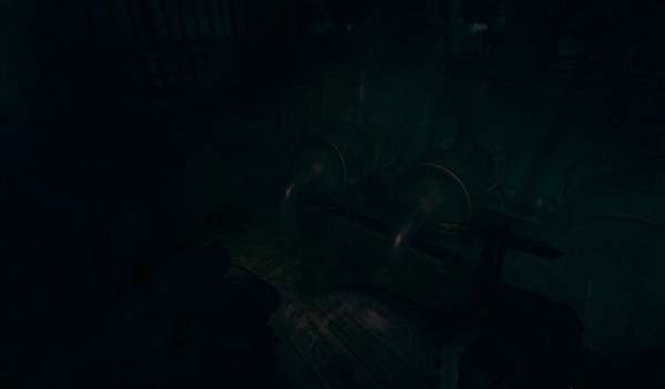 还在这个房间另外一边,能发现一条向上的楼梯,这个楼梯是视角不太好,其实是 T 字的,右边有个发电梯,但是保险丝坏了,直接顺路继续,拔掉门闩后能回到第一个发电机的位置,这里隔壁其实不止一个保险丝,取一个装回去就行。