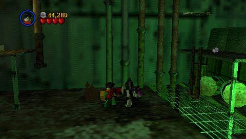 小心周围的绿色液体,打碎前面的大门后进入。使用远程攻击打碎上方的两块木板,将掉下的碎片拼成服饰装置,让 Robin 换上 Attract Suit。