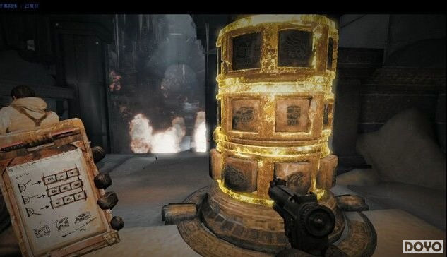 顺序别错了,不然又要从头来。火焰燃烧以后对面的雕像就会自动闪到一边去。我们就能进去了,然后里面是另外一个机关,这个很简单,拿出笔记本查看上面的图案提示,通过右边操纵杆改变可调整的高度就能搞定了。