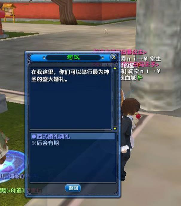 寻找 NPC:司仪 由队长与 NPC 对话,进行结婚典礼任务。(之前大礼包中赠送的高级婚礼礼券需要全部放在队长身上)