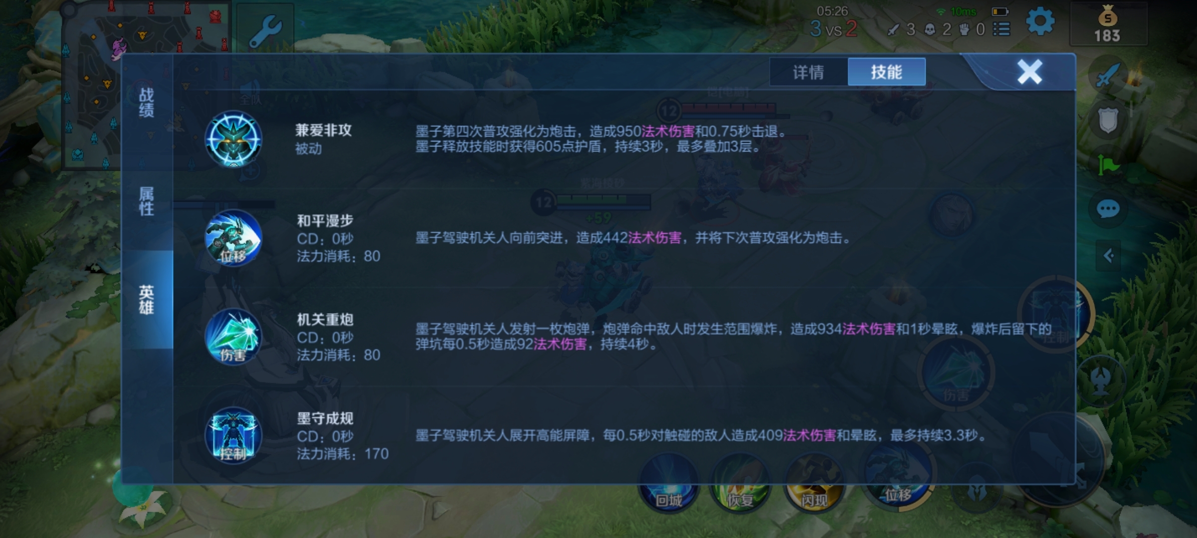 值得注意的是墨子的每个技能都能接闪现打出好的效果,所以带闪现很不错。而且墨子技能释放后都会获得一个护盾,多次释放技能可以叠加,最多能叠加三层!这应该是造成墨子会比较肉的原因吧。