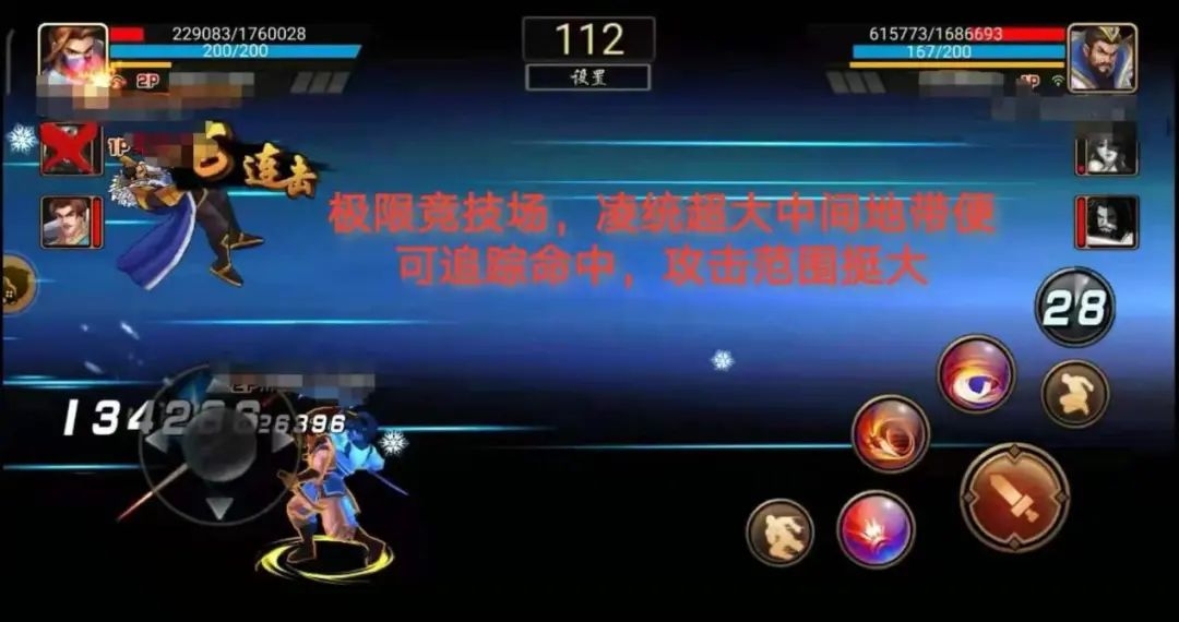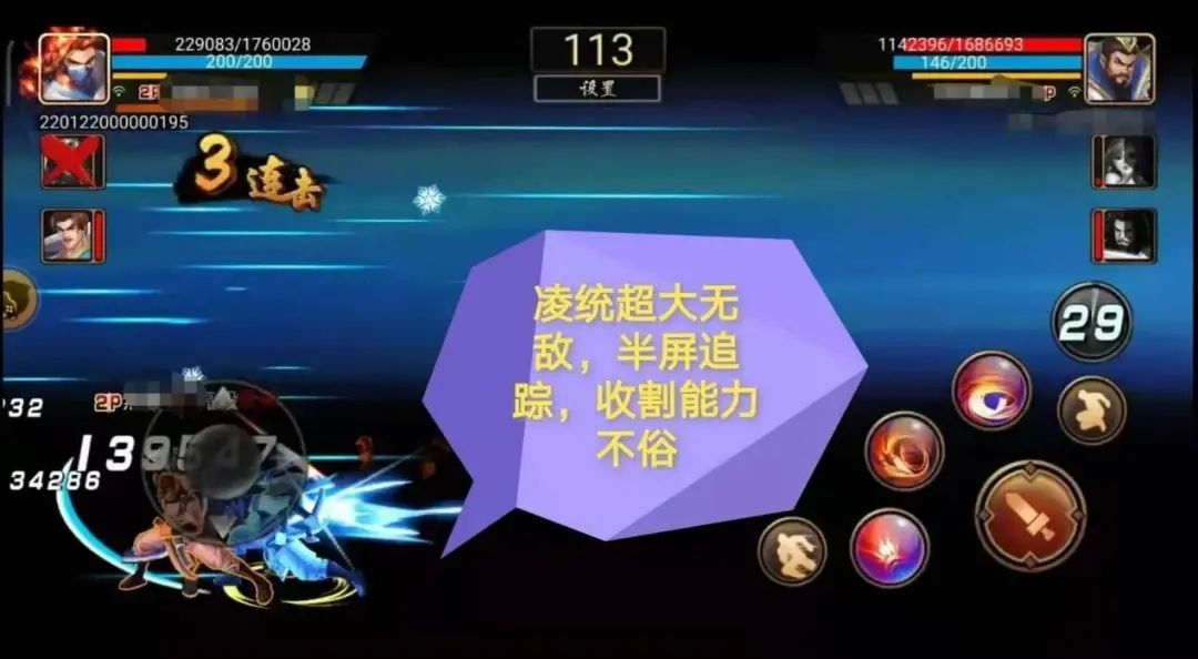 竞技中,利用凌统步伐极快的优势,不断地靠近对手再反向冲刺,最后在错位的身位上,采用三技能起手,充分利用 Y 轴攻击范围的优势,抓住对手后,衔接连招,然后切将一套带走对手。
