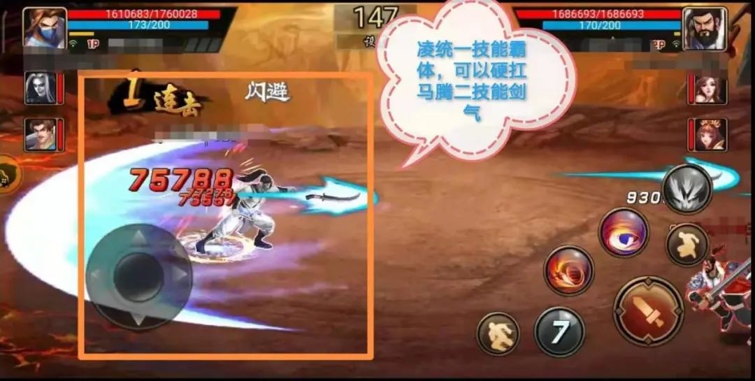 建议三技能先手连二技能连一技能,当然一技能也是带霸体效果可以硬扛马腾的剑气,上面有一张图片,马腾远距离习惯性冲刺加二技能剑气消耗对手,凌统可以很好的反制马腾这一远程套路拳,凌统可以利用一技能六把飞刀远程反击,和马腾互拼伤害。