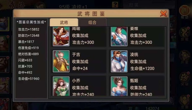 招募凌统后,激活单人图鉴,生命值+1200;与甘宁、黄盖构成三人图鉴“吴国勇烈”,防御力+1176(小编是联运平台,全渠道数据减半)。