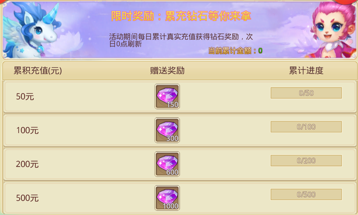 活动期间每日累积真实充值获得钻石奖励,次日 0 点刷新(以游戏中实际显示的为准)。