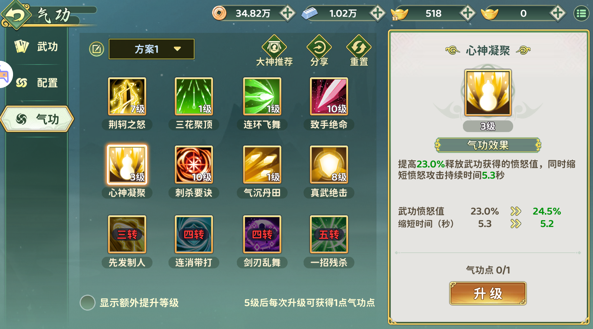 心神凝聚能够提高释放武功获得的愤怒值,和荆轲之怒是相辅相成的技能。