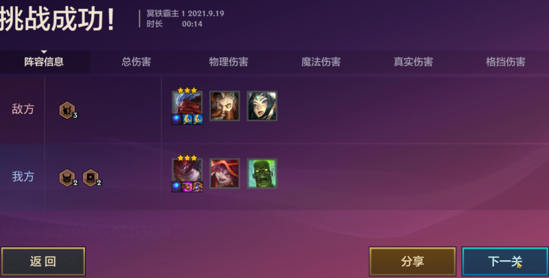 敌方阵容 3 重骑兵+2 小恶魔,3 星吉格斯装备和咱们第一关出装一样,这是来报仇来了啊!