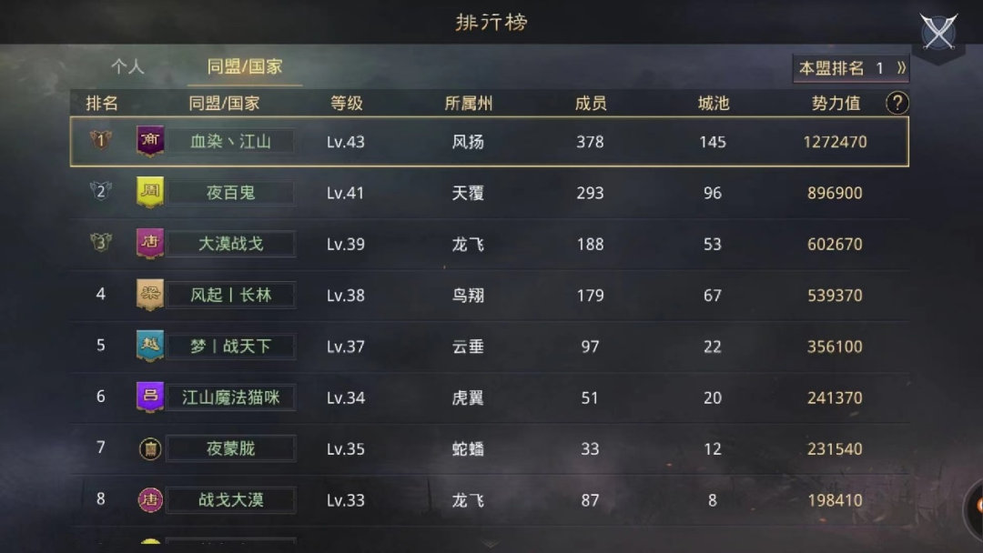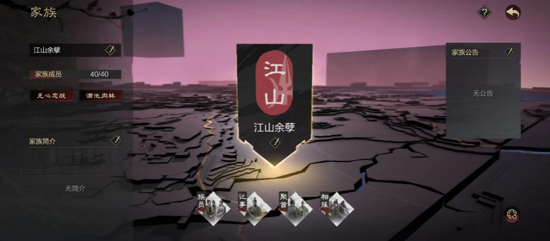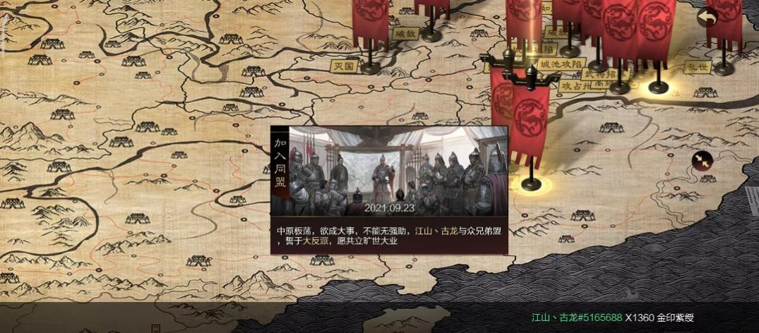 有人离开,也就有人留下来,【江山】小红和古龙便组织起剩下的霸霸团、工程组合并为江山团,继续扛起【江山】大旗。他们 成立“江山余孽”家族继续征战率土,因而【江山】在率土的故事延续至今。