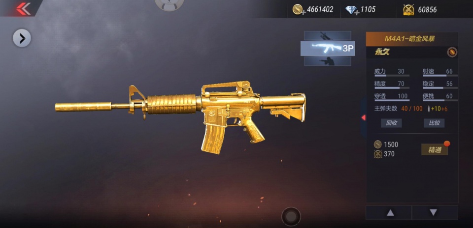 暗金风暴其实就是一把黄金色没有那么明亮的黄金 M4,除了颜色上缺少一点光泽之外,和黄金系列的其他 M4 没有任何区别。暗金风暴是 V6 的专属特权,只要是 V6 及以上的小伙伴就能够获得这把武器的永久版,因此这把武器也算是“氪金玩家的白嫖武器”。暗金风暴虽然性能一般,但是手感不错,值得入手!