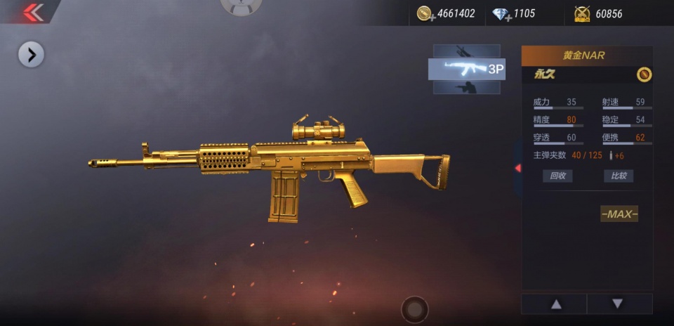 黄金 NAR 原本名为 81 改,后来与系列首款 81 改-赤子心和黄金 81 改一同更名为 NAR。NAR 本来就是 CF 手游中最强的开镜步枪之一,而黄金 NAR 更是目前 NAR 系列中性能最强的!不过黄金 NAR 目前已经绝版,而上架之初是由活动产出,能够白嫖,错过的小伙伴还需要耐心地等待返场!